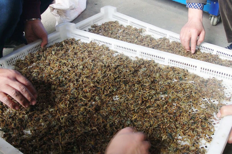 隨后,由我廠技術人員陪同客戶,為客戶演示整個加工過程,加工前先把蝎子用冷水浸泡,并反復沖洗幾次,以洗掉蝎子身體上的泥土和其他雜物,洗凈后撈出,放到事先準備好的盆內。