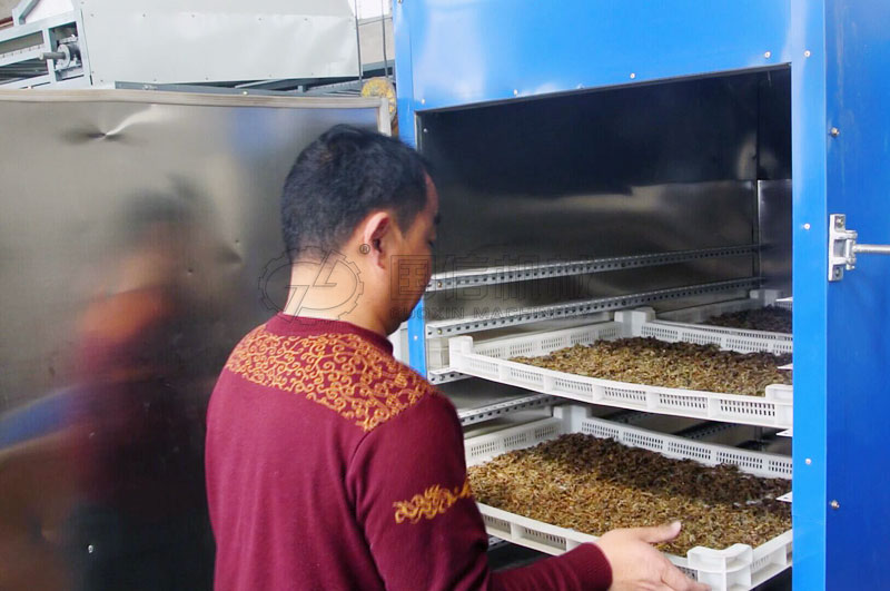 接下來把洗凈的蝎子裝盤,放到烘干箱進行干燥,據技術介紹:在蝎子的加工過程中,動作一定要輕拿輕放,盡可能保持蝎子的完好,避免因斷頭、尾、足,降低了蝎子的藥效。