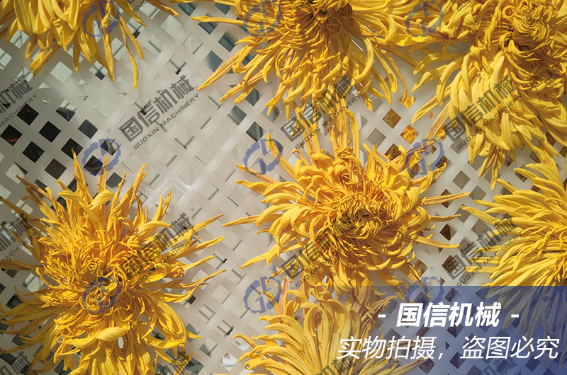 (部分菊花需要?dú)⑶嚯A段:設(shè)置溫度65℃~70℃,時(shí)長(zhǎng)2~3小時(shí),如果需要,可以在進(jìn)料前在鮮菊花上噴灑少量清水,殺青效果更好。)