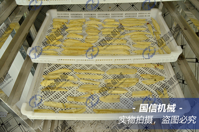 6.烘干:將切好塊或條狀的地瓜(紅薯)均勻擺放于托盤,后放置在推車推入烘干房,通過空氣能熱泵烘干房的觸摸屏進行烘干設置,初始溫度設置65℃,時長設置四小時,第二段溫度60℃,時 間長度也是四小時,第三階段將溫度設置到55℃,烘干到預期的水分含量后,空氣能地瓜烘干房會自動完成整個烘干過程,結束后自動停止。
