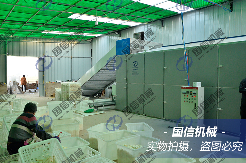 山藥烘干使用的是流水線網帶式烘干,烘干方式是動態烘干,通過網帶式烘干機的幾層不銹鋼網帶不停翻轉,實現對山藥的烘干。熱源一般使用的是燃燒型或者空氣能熱泵,熱量從底部進入烘干機內對山藥進行烘干,烘干過程中排出的水分從機器頂部的排濕口排出。我們在烘干山藥時,主要選擇的設備就是網帶式烘干機,選擇這種設備的好處是:一、網帶烘干機的產量比較大,每天的處理量可以從2噸到50噸不等。二、烘干時間短,因為網帶烘干機是動態烘干,山藥在設備中不停翻轉,所以受熱速度比較快,加熱比較均勻,烘干時間可以縮短幾個小時。