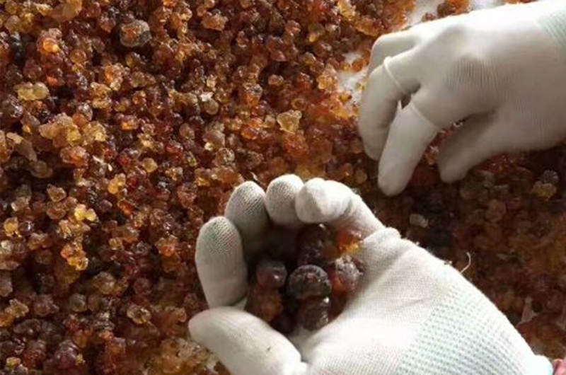 一、采收在桃、李、杏、櫻桃樹生長季度采收桃膠。用小刀削取上述樹種樹干上的膠質物,置于陽光下曬干,即為桃膠原料。采收桃膠時不得傷及樹皮。