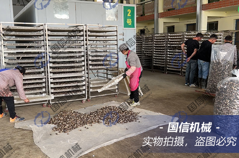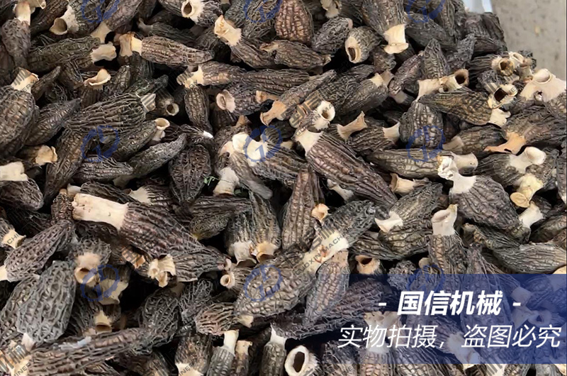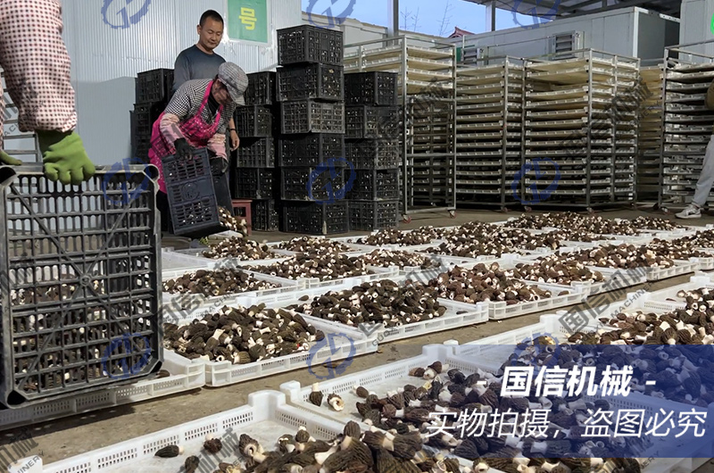 羊肚菌水分含量非常高,在烘干過中要特別注重溫度與濕度的控制。而且不同批次采收的羊肚菌其水分含量不一樣。一般來說,第一茬菇的含水量相對低,陸續(xù)第二茬菇、第三茬菇的含水量一批批加大,都可以在第一茬菇烘干經(jīng)驗的基礎(chǔ)上適當(dāng)加長時間。這里以第一茬菇的烘干為例,介紹羊肚菌的烘干經(jīng)驗: