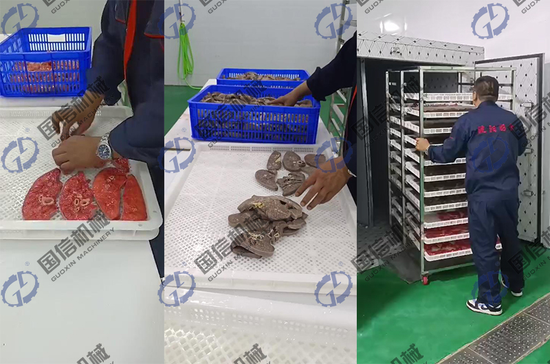 這是沈陽一位做寵物肉加工的客戶,大哥9月份定購的這臺空氣能熱泵烘干房,夫妻兩個開辦的寵物肉加工小作坊,先是把肉片平鋪到托盤上,然后推入到烘干房內,關好房門,最后一鍵設置好溫濕度就不用管了,烘干出來的效果大哥是非常滿意,連連稱攢!像這種做食品烘干加工我們建議使用空氣能熱泵烘干房,因為空氣能熱泵烘干房有以下優勢:
